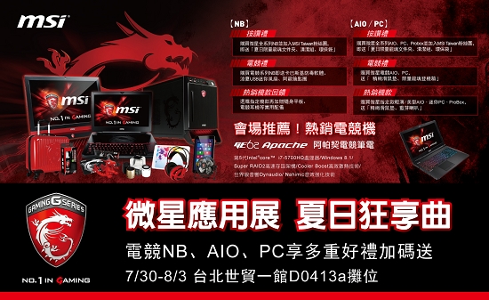 本次應用展微星領先業界推出多達11款高效能筆電,搶先搭載最新intel第五代四核心i7處理器,預期將成為展場詢問度最高的產品。第五代處理器帶來更強大運算能力,執行畫面細膩的3D遊戲,或對於處理器性能重度需求的工作,皆能帶來顯著的效能提升!其中全球獨創搭載機械式鍵盤的GT80電競機皇,更率先推出搭載i7-5950HQ處理器的頂級機款,讓消費者搶先享受極致高效的產品。展期間只要選購MSI電競筆電,即享有總價$2,500以上的加碼好禮,包括卡巴斯基防毒軟體兩年份、阿龍公仔鑰匙圈、USB迷你風扇!